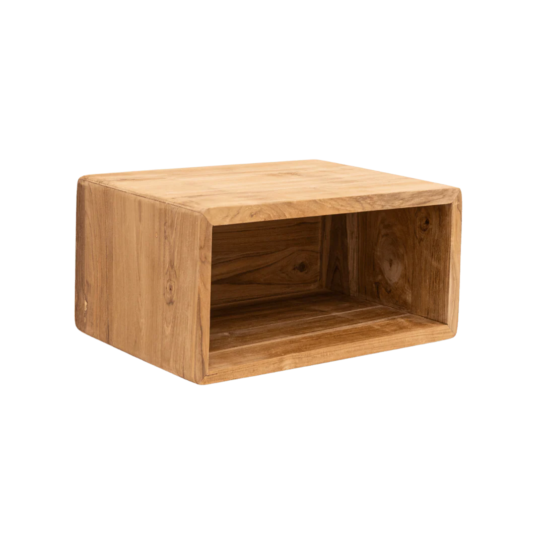Wall-mounted teak wood night stand with a minimalist design. Crafted in Indonesia from natural teak wood. 40×30×20 cm.