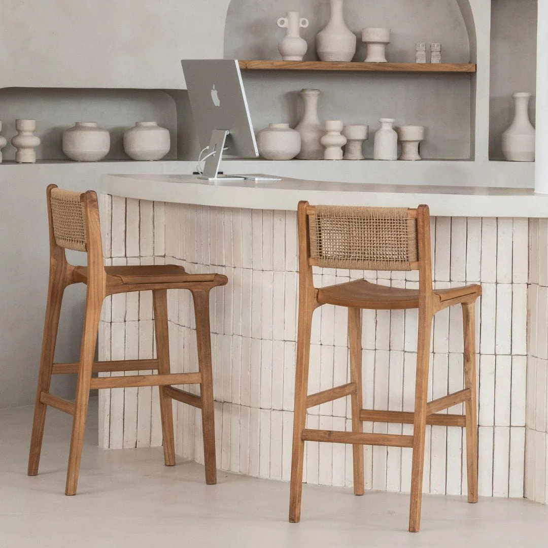 A handcrafted bar stool made from teak wood, bovine leather, and jute — a perfect balance of boho charm and natural elegance.